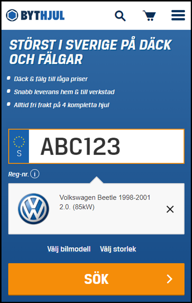 Ange ditt registreringsnummer. Om du har en personlig skylt ska du ändå ange den vanliga kombinationen för din bil. Tryck sedan på Sök så får du fram tillbehör för just din bil!