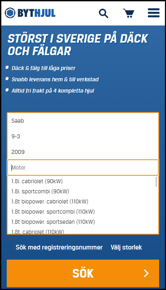 Ange ditt bilmärke, därefter modellnamnet och året bilen tillverkades. Avsluta sedan med vilken motor du har. Därefter kan vi rekommendera däck och fälgar som passar just din bil!